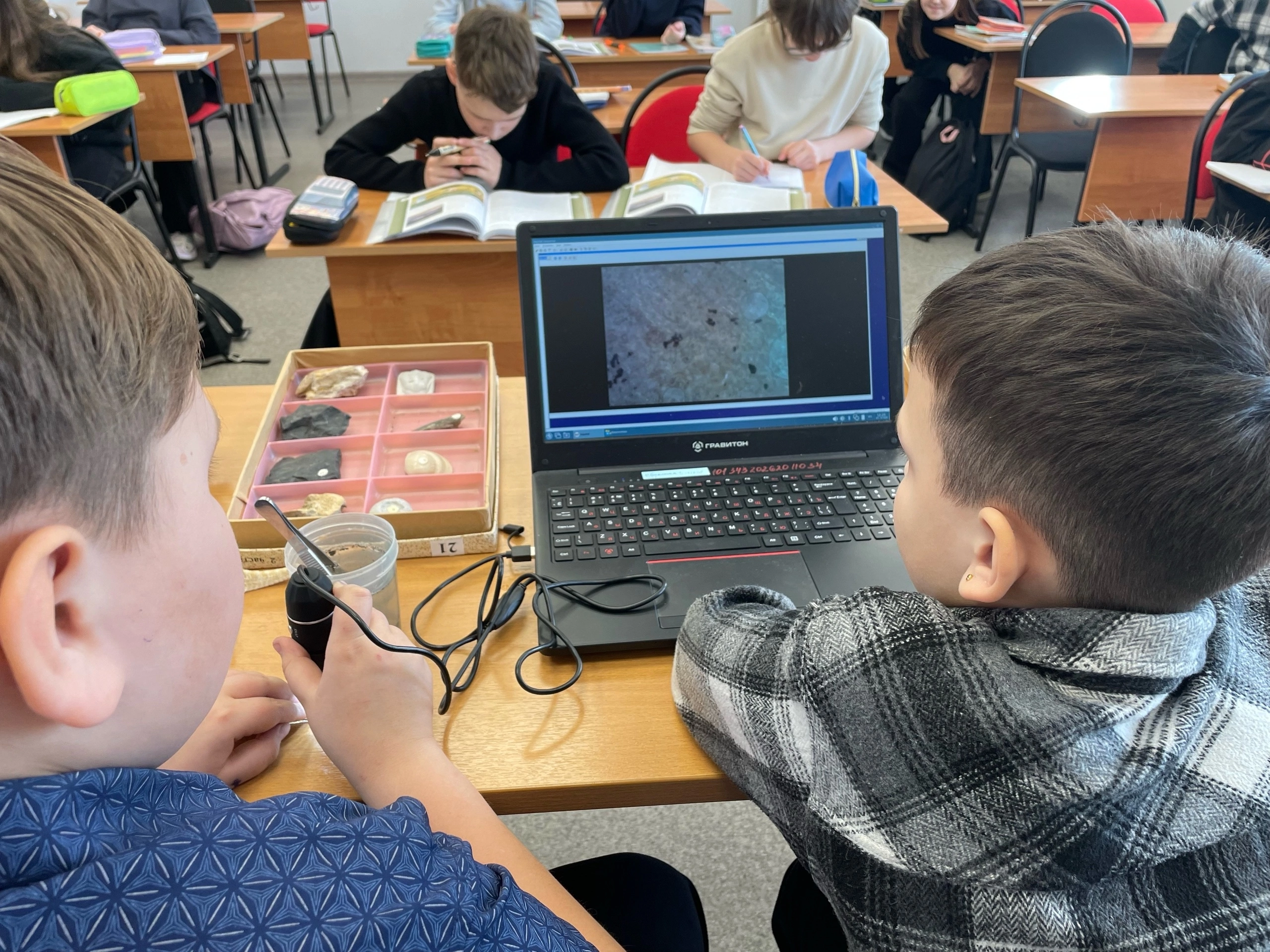Практические работы всегда являются интересными моментами в проведении уроков. Обучающимся нравится наблюдать, сравнивать, экспериментировать, делать определенные выводы. На уроке биологии пятиклассники, пользуясь современным оборудованием «Точки роста», изучали состав почвенной и водной среды. Широкое разрешение и высокое качество изображения позволило детально рассмотреть мельчайшие частицы почвы и воды, что вызвало большой интерес у ребят.