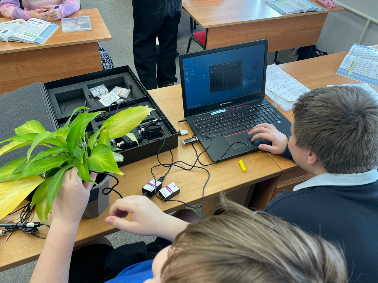 На уроках биологии обучающиеся с большим интересом используют оборудование "Точки роста". При помощи цифрового датчика измерения влажности обучающиеся наблюдали за изменением влажности воздуха в классе и в цветочных кашпо при поливе почвы. Датчиком показателя плотности проверяли процент плотности разных предметов, а также мутность воды. Благодаря такому оборудованию уроки биологии становятся более интересными и запоминающимися.