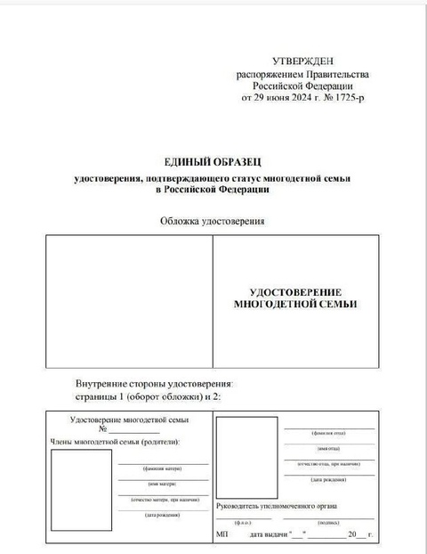 Распоряжением Правительства российской Федерации от 29 июня 2024 г. №1725-р утверждена форма удостоверения многодетной семьи на территории Российской Федерации.